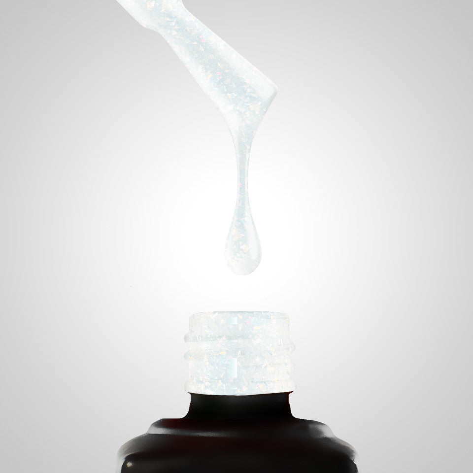 Il s’agit d’un blanc milky agrémenté de minuscules paillettes style confetti.