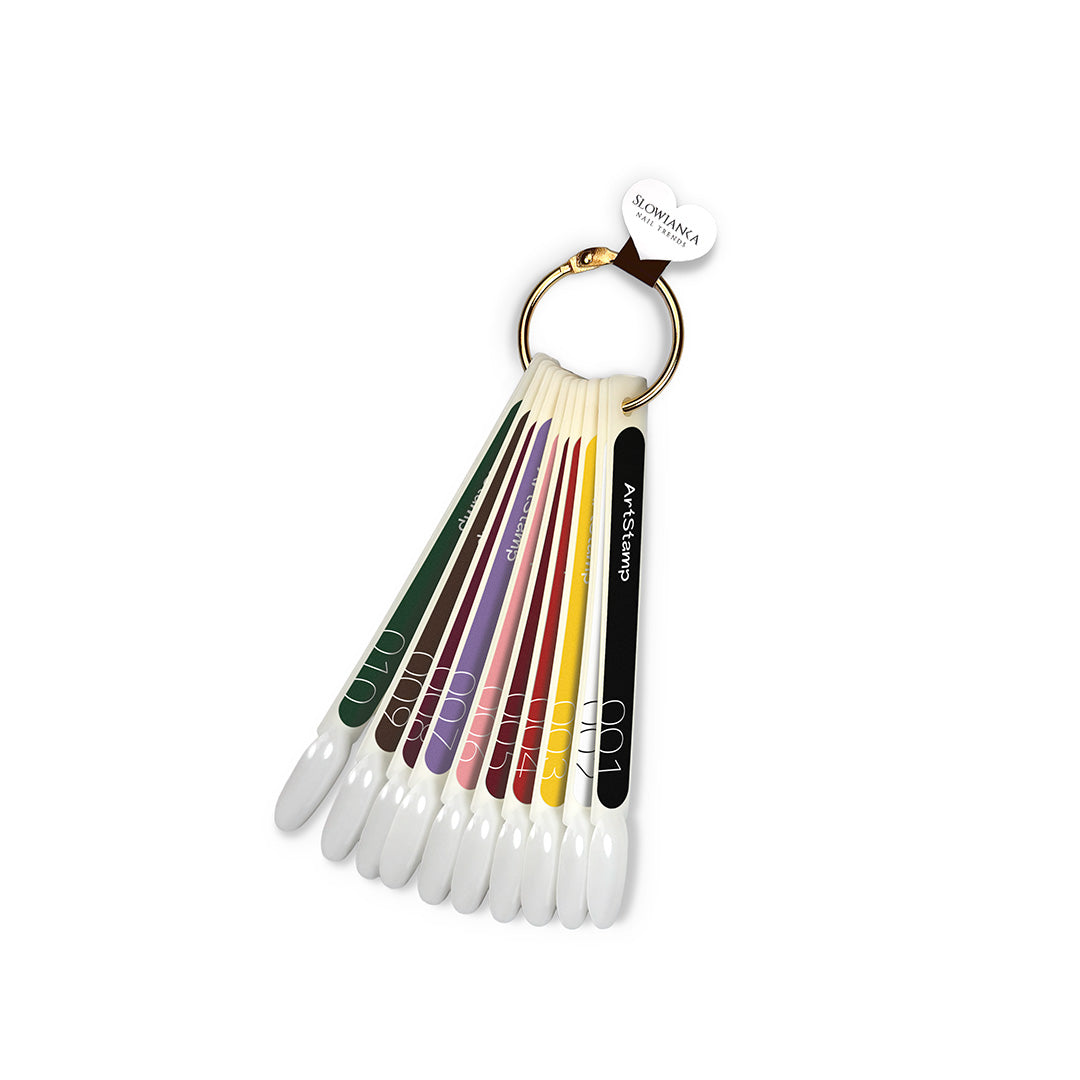 Le nuancier des vernis ArtStamp de Slowianka est un outil pratique qui permet de présenter de manière esthétique toutes les teintes de la collection. L’ensemble comprend un coffret complet de faux-ongles, des autocollants avec la numérotation des couleurs ainsi qu’un anneau métallique pour les rassembler. Grâce à cet outil, la styliste peut facilement montrer à la cliente l’effet réel du vernis pour stamping et ainsi choisir plus rapidement la couleur adaptée à la stylisation. Idéal pour une utilisation en salon et pour présenter la gamme complète des couleurs ArtStamp.