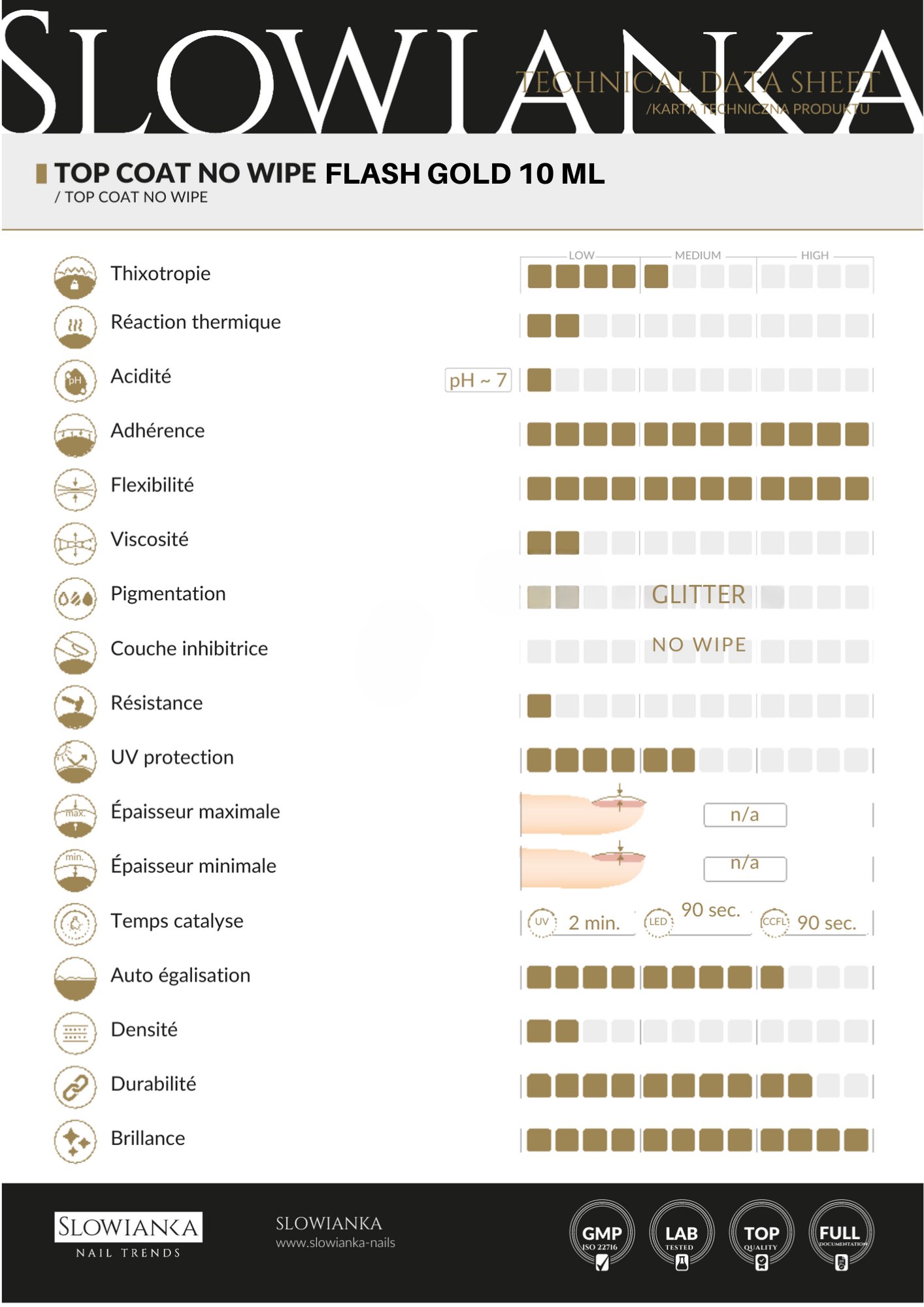 - S’auto égalise parfaitement en créant une superbe ligne de lumière sur l’ongle